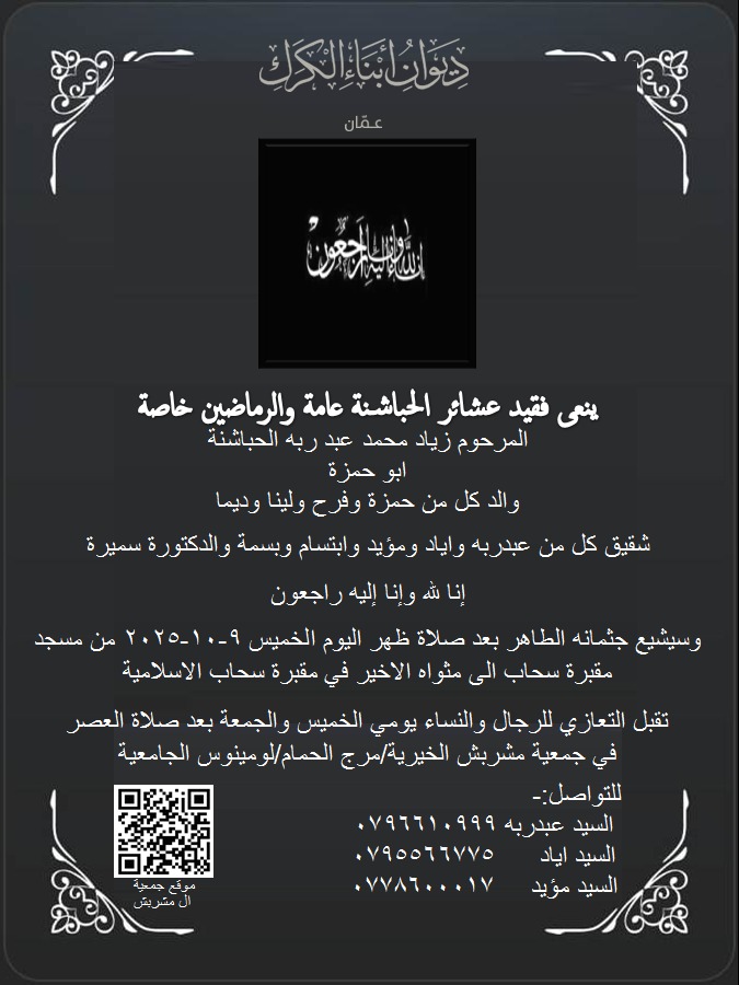 ينعى ديوان ابناء الكرك/عمان فقيد عشائر الحباشنة عامة والرماضين خاصة