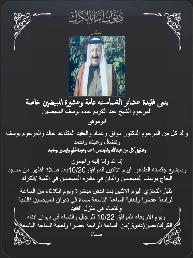 ينعى ديوان أبناء الكرك/عمان فقيد عشائر الغساسنة عامة وعشيرة المبيضين خاصة