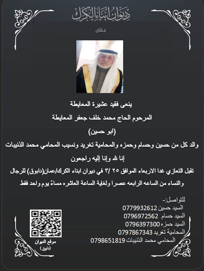 ينعى ديوان ابناء الكرك/عمان فقيد عشيرة المعايطة