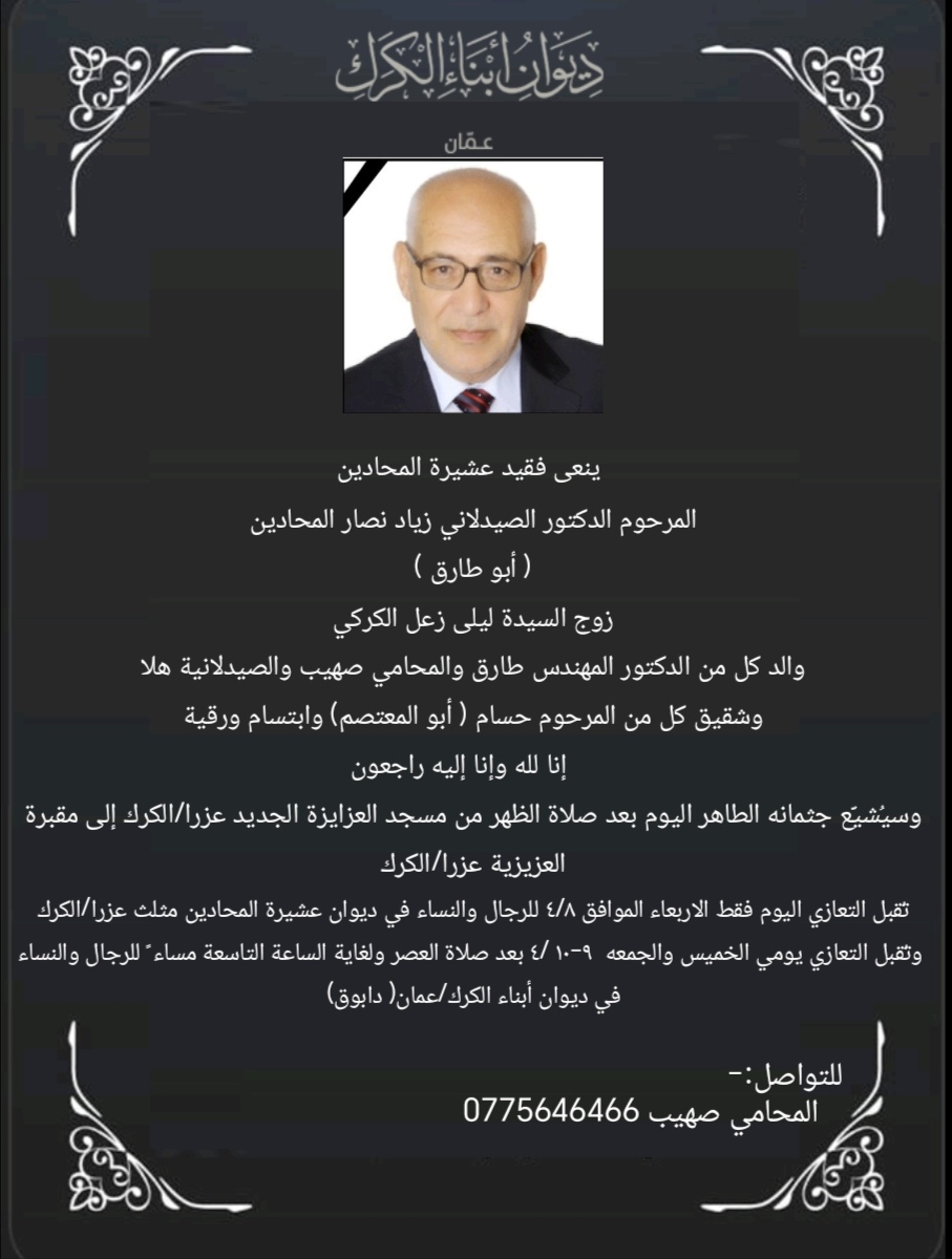 ينعى ديوان أبناء الكرك /عمان فقيد عشيرة المحادين