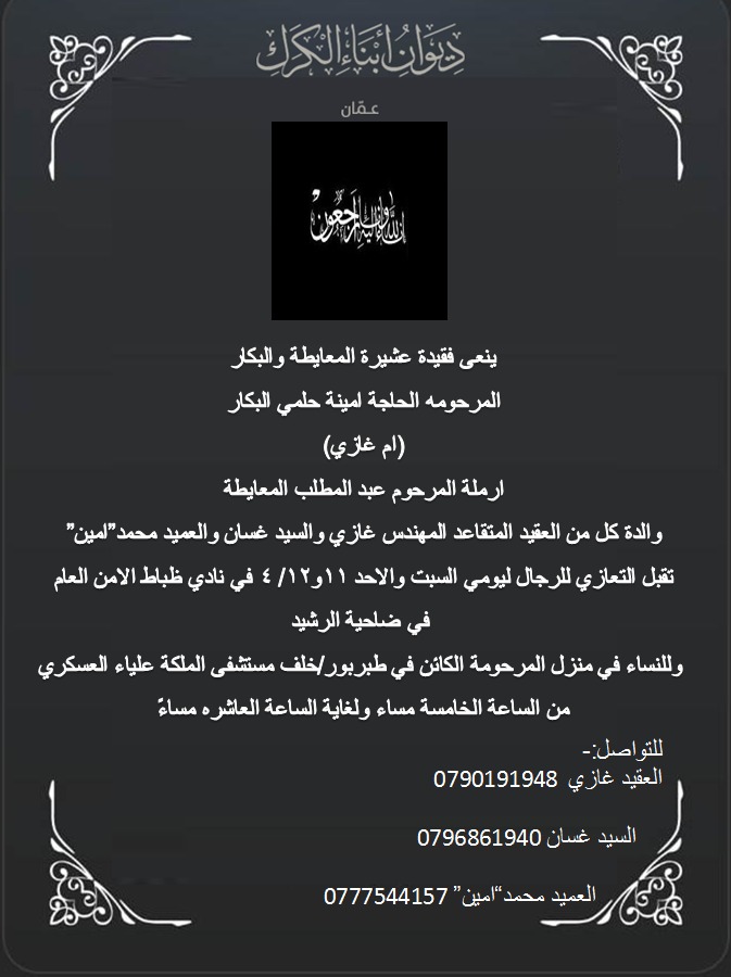 ينعى ديوان أبناء الكرك/عمان فقيدة عشيرة المعايطة والبكار