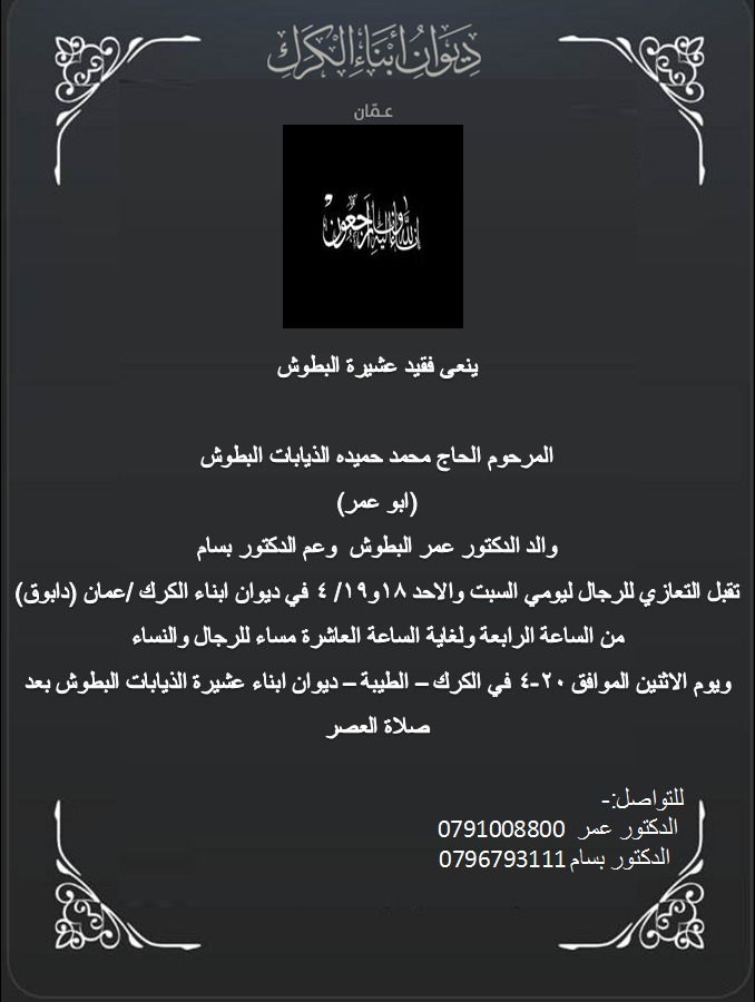 ينعى ديوان ابناء الكرك/عمان فقيد عشيرة البطوش
