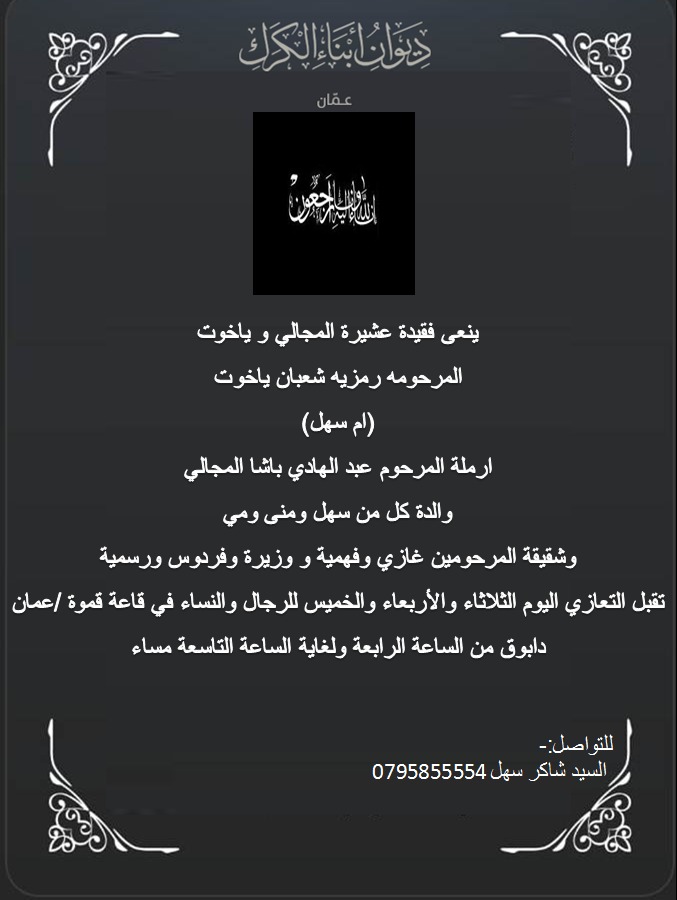 ينعى ديوان ابناء الكرك/عمان فقيدة عشيرة المجالي وياخوت