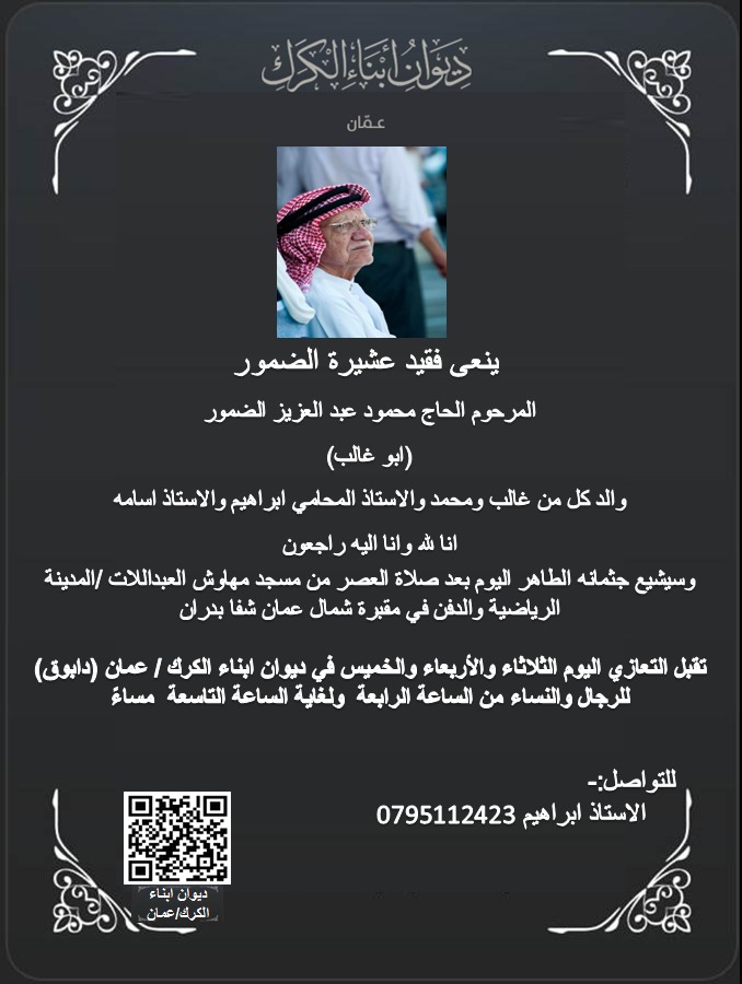 ينعى ديوان ابناء الكرك/عمان فقيد عشيرة الضمور