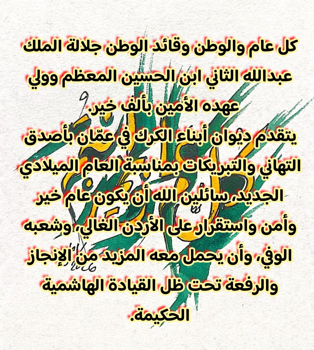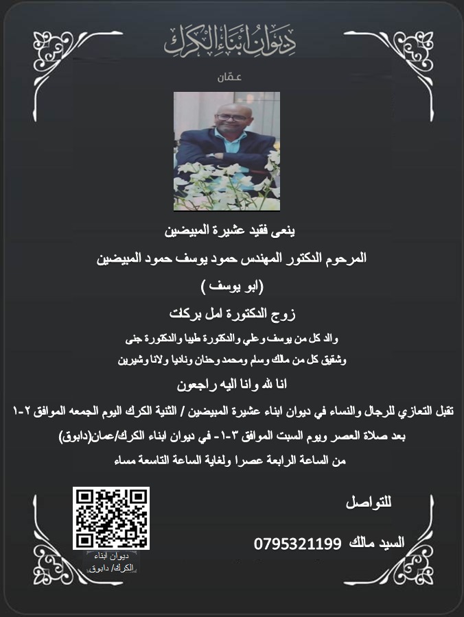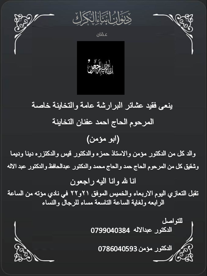 بسم الله الرحمن الرحيم ﴿سُبْحَانَ الَّذِي أَسْرَىٰ بِعَبْدِهِ لَيْلًا مِّنَ الْمَسْجِدِ الْحَرَامِ إِلَى الْمَسْجِدِ الْأَقْصَى الَّذِي بَارَكْنَا حَوْلَهُ بمناسبة ذكرى الإسراء والمعراج، يتقدّم ديوان أبناء الكرك في عمّان بأسمى آيات التهنئة والتبريك إلى مقام حضرة صاحب الجلالة الهاشمية الملك عبد الله الثاني ابن الحسين المعظم،وولي عهده الأمين الأمير الحسين بن عبد الله الثاني وإلى الأسرة...Read More